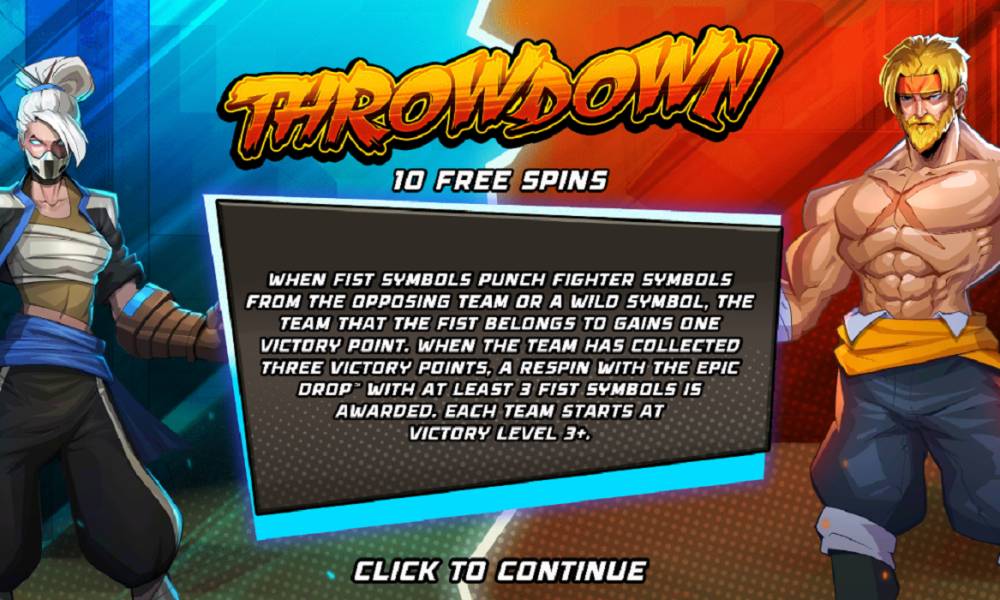 The Throwdown! Bonus is activated when three scatter symbols appear, offering ten free spins. During the bonus, teams battle it out, earning victory points and increasing their level.