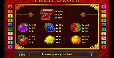 All the bonus features available in «Fruit Drops» slot machine, have been already discussed above. Any other bonus rounds, extra payouts or preferences are not provided.