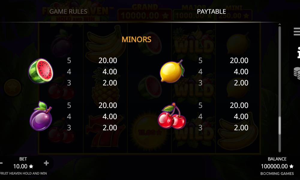 There are 3 jackpots in the Fruit Heaven Hold And Win: Mini (x25), Major (x100) and Grand (x1000). You can win any of them only in the Hold And Win round. The first 2 jackpots are paid out if at least 1 symbol with the corresponding inscription falls on the field.