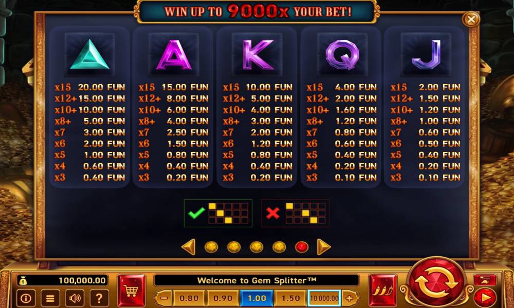 Wild symbols can replace any regular symbols, helping to form winning combinations. The maximum win in the Gem Splitter pokie reaches an impressive 9000x of your bet. To achieve the maximum winnings it is recommended to play with high stakes. The higher your bet, the bigger the potential winnings.