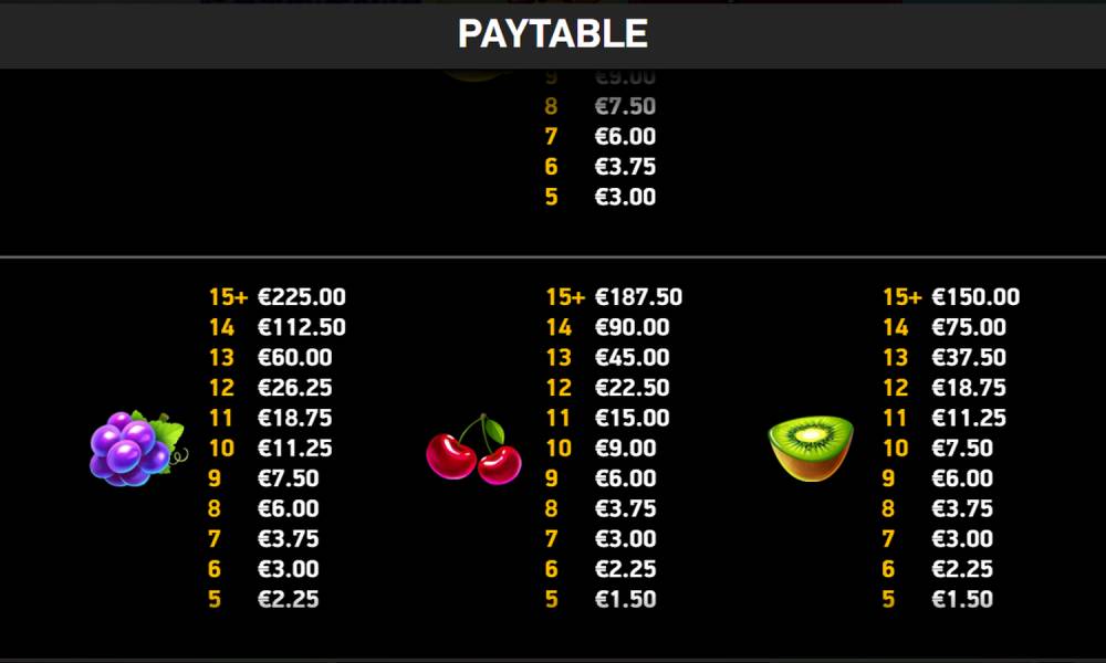 Frequency of payouts - about 18-20 times in every 100 spins. The 2+ cascades in 1 spin appear about 10-12 times per 100 spins.