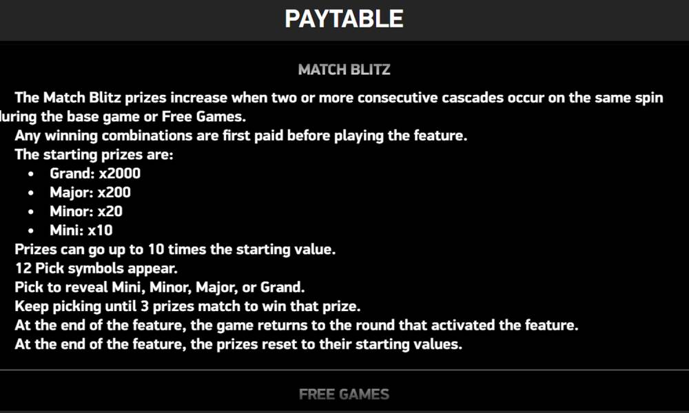 Match Blitz. This is a jackpot round with 12 cells that are filled with identical symbols. It can trigger on each series of 2+ cascades. There is a jackpot hidden under each of the symbols. The player needs to unlock the symbols. When the player unlocks 3 identical jackpots - he gets this prize.
