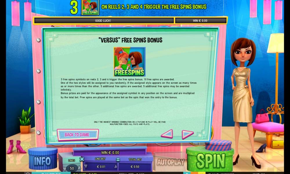 - Free Spins are presented at the three central reels. When these symbols drop at all three reels in the same time, ten free spins begin. The casino stakes instead of the player during these spins. It amount as well as number of the active lines remain the same. The special features connected with the fashion world are in force during these round. We won’t open all secrets, but note that you can win extra prize spins.