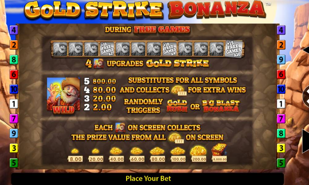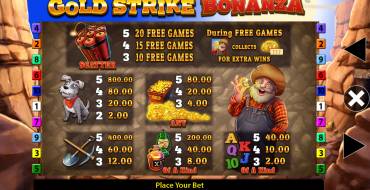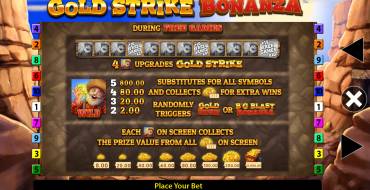 When entering the Gold Strike Bonanza Fortune Play pokie machine, the user immediately sees a brief description of the features. He can familiarize in detail with the rules and payout table in the menu. To start the game, the user needs to: