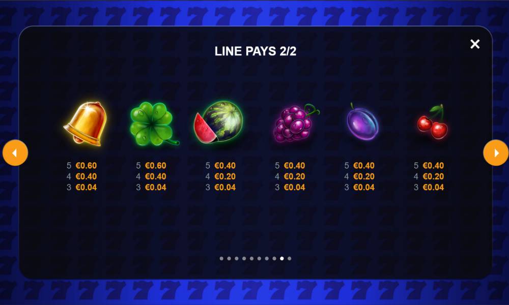 The medium-sized field (5 reels in 4 rows) plays 6 junior symbols (fruit, bell and clover) and 4 senior symbols (sevens of different colors). The payout mechanics is by lines. There are 40 of them in total, all of them can be seen in Paytable. The number of lines cannot be reduced. The size of the bet can be from 0.10 to 20 euros, or the currency that the casino has set. The win limit is huge and is x50000.
