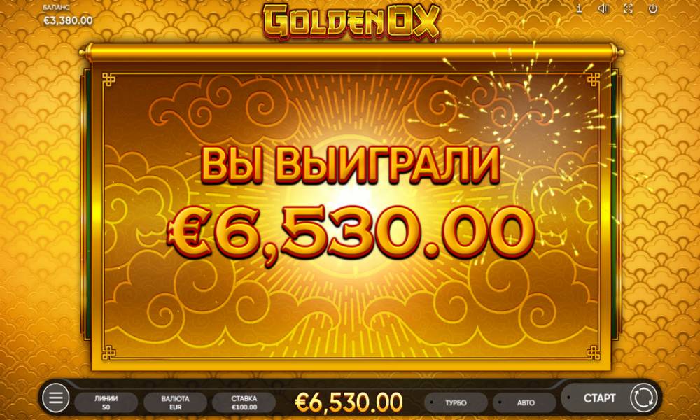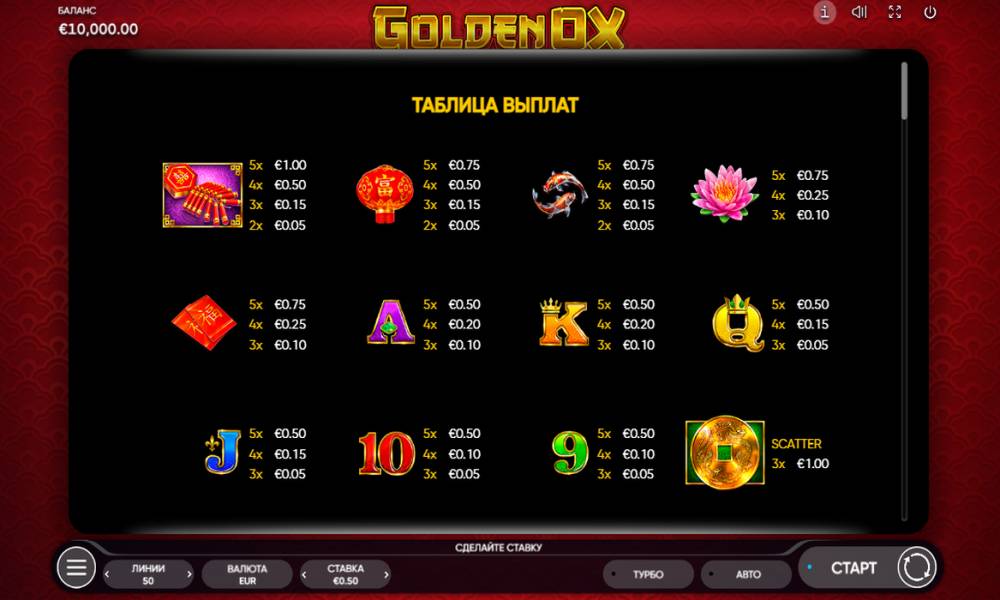 Golden Ox game comes on 5 reels in 4 rows and 50 paylines. The betting range is defined in sizes from 0.5 to 200 coins. For a winning combination requires a combination of identical symbols in a row on neighboring reels, accounting is carried out from left to right from the leftmost reel. The Scatter symbol is counted anywhere. When falling out the same symbols in the number of 3 or more (for some - 2 or more), the set rate is multiplied by the coefficient. Its value depends on the number of symbols on the field. The minimum multiplier is x0.1, the maximum - x2 to the bet.