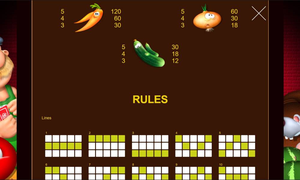 The Green Grocery has an uncomplicated set of rules for the regular mode. The 5x3 game board has 15 lines to account for combinations.