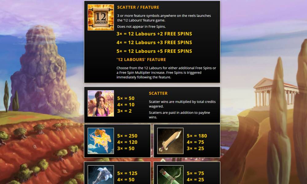 Please read about bonus options, exceptions from the general rules and types of symbols of the Hercules: The 12 Labours below in the review.