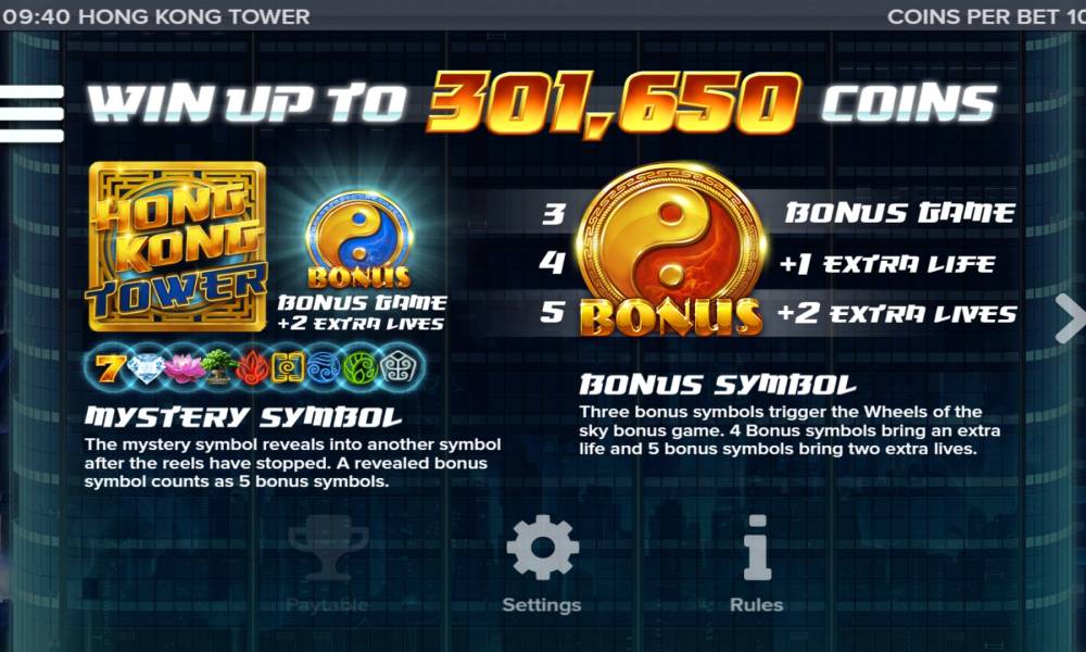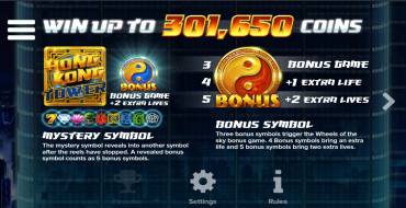 - Mystery (a logo of «Hong Kong Tower») – this symbol turns into one of ordinary or special symbols when it shows at the screen. If is turns into Bonus, it is taken as five such symbols.