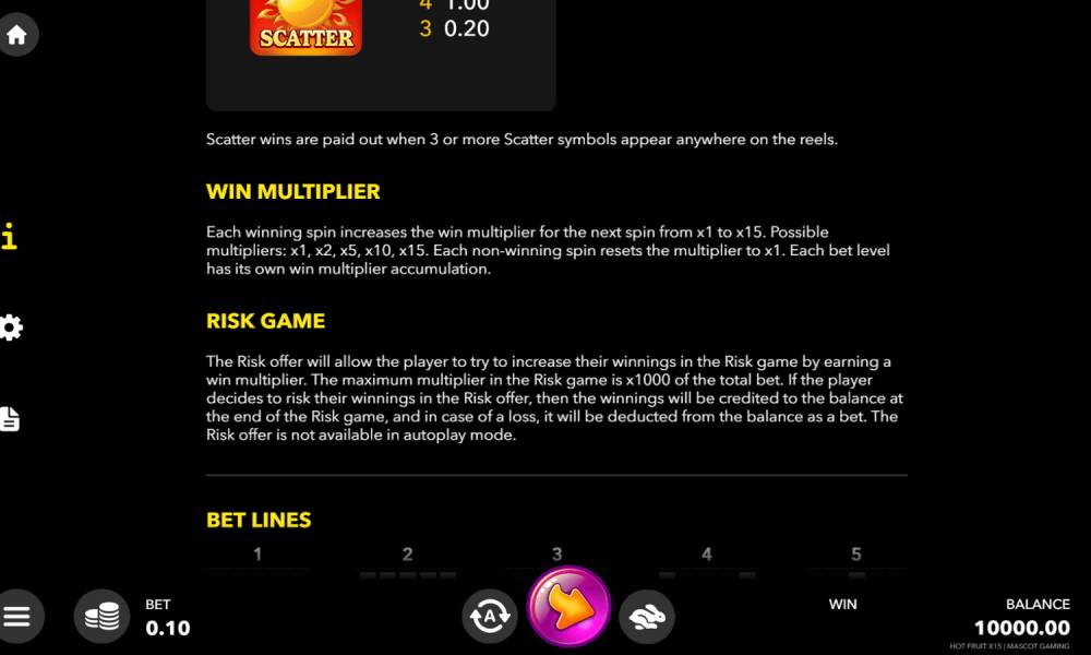 Hot Fruit x15 is a pokie with line payouts. They work both ways (left to right and right to left). There are 10 fixed lines, their number cannot be changed. Each must include a minimum of 3 identical symbols. The size of the field 5x3. In total, the game involves 10 symbols, of which 8 simple and 2 special. From the bonus features added risk round and additional multipliers for each win if they fall 2+ in a row.