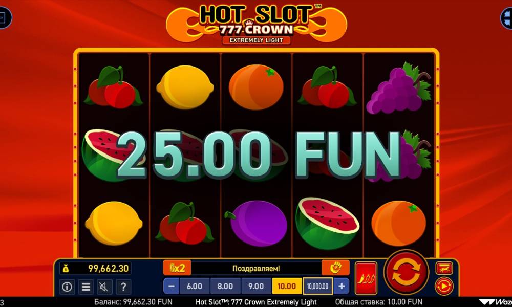 In April 2024, Wazdan released an unusual for modern players, but very beautiful pokie called the Hot Slot: 777 Crown Extremely Light. It is part of the Hot Slot series, which has existed since the beginning of 2022, and which already has more than a dozen pokies. 777 Crown Extremely Light is interesting in its design: it is decorated in the styles of "retro" and "fruit", but drawn in a minimalistic way. Bonus features, complex combinations and confusing conditions are not here: everything is as simple as possible. The only unusual features are volatility settings and risk-round with 7 levels.
