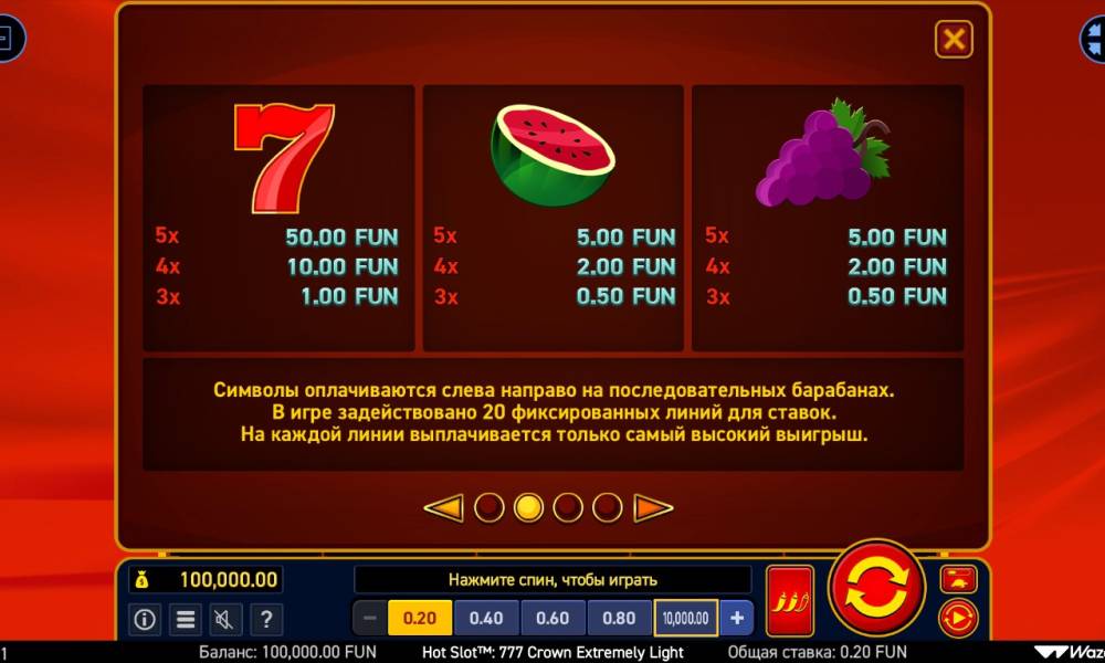 The interface of the Hot pokie: 777 Crown Extremely Light may be nostalgic for those who found pokies in the early-mid 2000s: there is nothing superfluous in it. To start playing you need to: