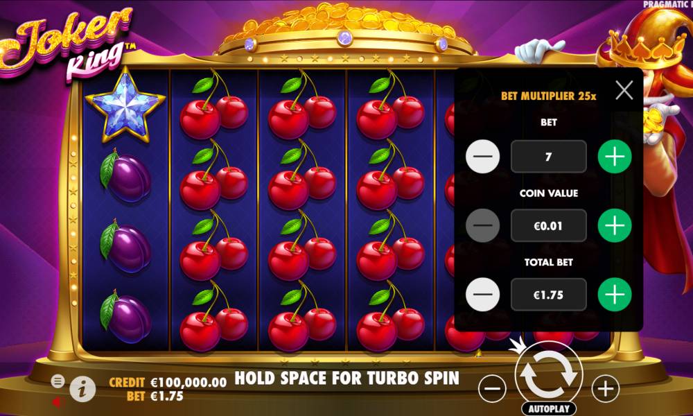 The Joker King slot machine from the Pragmatic Play provider has a standard 6x4 playing field with 25 pay lines.