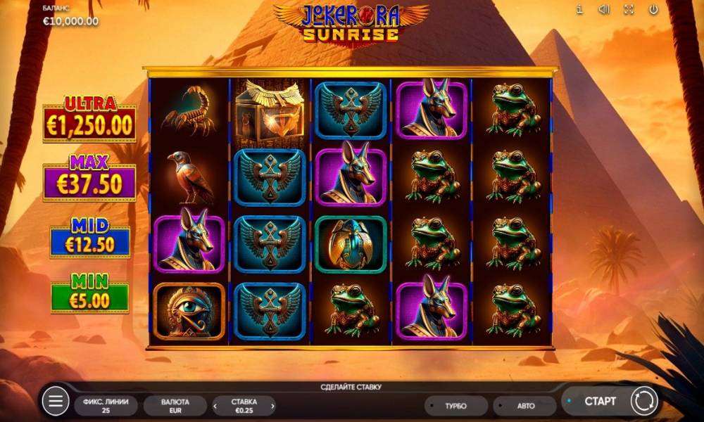 The Joker Ra: Sunrise video slot is a complete immersion in the atmosphere of Ancient Egypt. The game is played against the backdrop of pyramids with the participation of classic symbols associated with the supreme sun god Ra. Each spin of the reels promises magnificent treasures, and very often the promises are realized in ringing coins, because the slot uses modern bonus mechanics, free spins, large multipliers and jackpots, as well as the traditional game of risk.