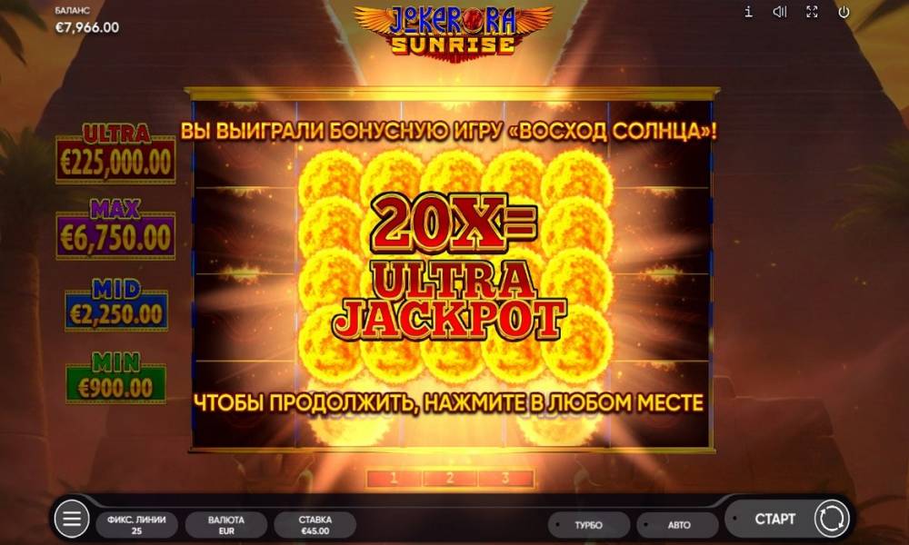The player gets 3 attempts, and in the case of the bonus symbol, the rotation continues and lasts until all cells are filled with prize symbols. Completely filled field of 20 Bonus symbols gives a large award - Ultra Jackpot in the amount of 5 000 bets. All wins at the end of the bonus game are totaled.