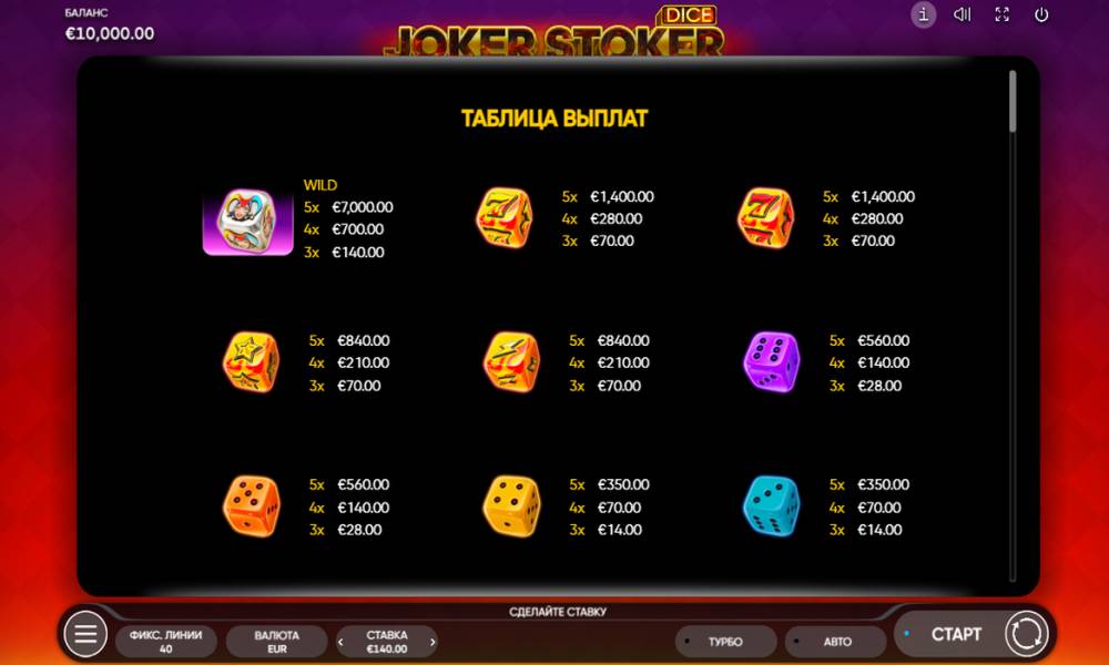 In the Joker Stoker Dice online pokie the game is played on a field with 5 reels in 4 rows and 40 fixed paylines. The betting range is from 0.40 to 140 coins. Winning combinations are made up of identical symbols, which must be next to each other on adjacent reels. Counting is carried out from the leftmost reel. Scatter symbol is counted regardless of its location. Each of the symbols falling out on the reels in one or another number, brings a multiplier, the sizes of which are specified in the pay table. The maximum multiplication is for 5 Wild cubes - x50!