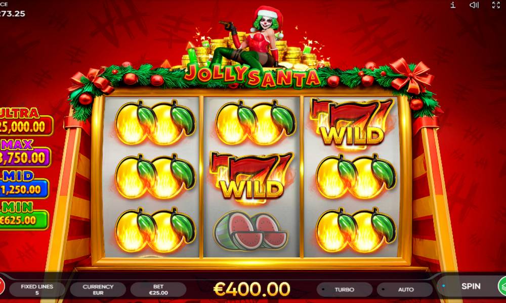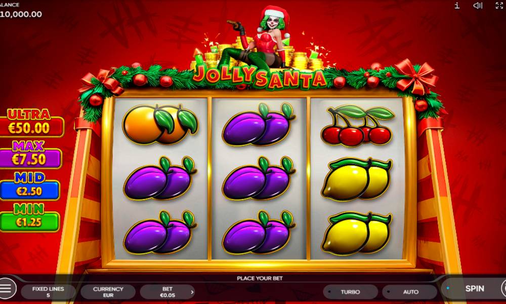Endorphina's fruity Jolly Santa online pokie offers an unconventional vision of Christmas entertainment. The game is supervised by a sexy girl in a Santa suit and Joker makeup with a gun in her hands. This is Jolly, who will make sure to top up your wallet to a maximum of x2,500 to your bet with a bonus game with free spins and jackpots, as well as a risk game.