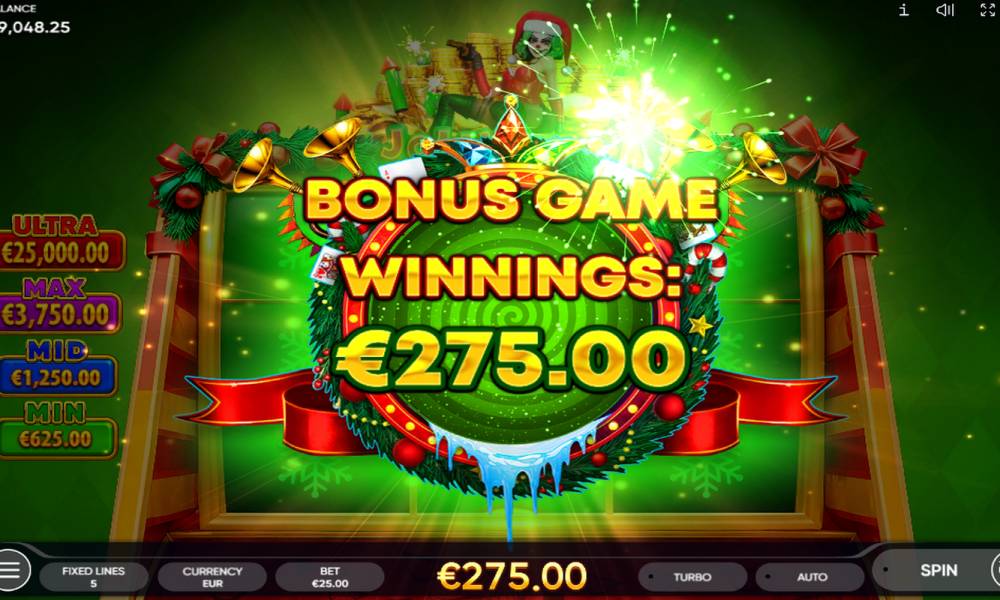 Special symbols. Presented in the form of gold coins of two types: a simple coin and a coin with the image of Joker Jolly. Simple coins fall out on the 1st and 3rd reels, the coin Jolly - on the 2nd. Are the trigger of the Crazy Xmas bonus game, if simultaneously appear in the number of 3 or more pieces. Bring regular prizes and jackpots of different sizes, which are paid only during the bonus game.
