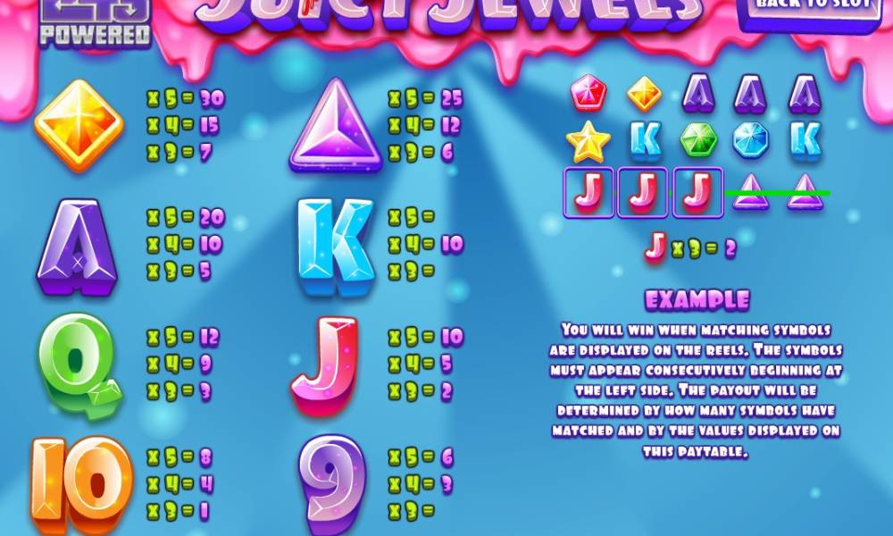 «Juicy Jewels» allows to set up the sound parameters, speed of the gameplay and options of automatic game. Most of online casinos provide an opportunity to play this slot not downloading any special software to the hard drive. Mobile version was designed for comfortable playing on smartphones.