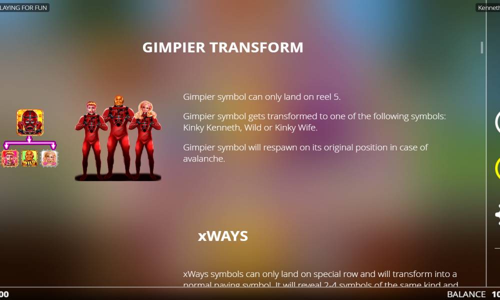 Gimp Transform. Two Gimp symbols on the field will be transformed into random xWays, xNudge, Wild, Kinky Kenneth, Kinky Wife.