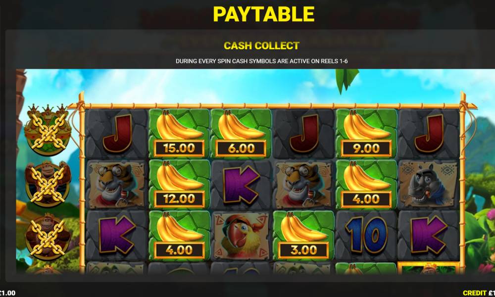 Cash Collect is King Kong, which only stops on reels 1 and 6. It always opens to the full reel and collects bananas from the field.