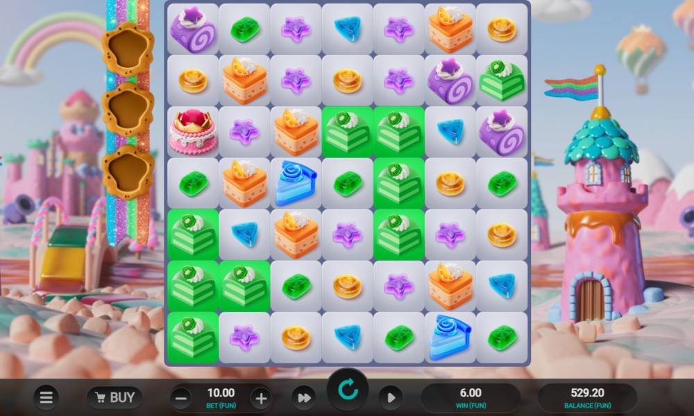 Free spins are played according to the rules and at the bet of the round in which their activation took place. Candy Cannon, Sweet Upgrade and Candy Cluster features can be played during the attempts. On the left are the counters for the bonuses, and once all three are filled, the player is awarded 1 more Free Spin.