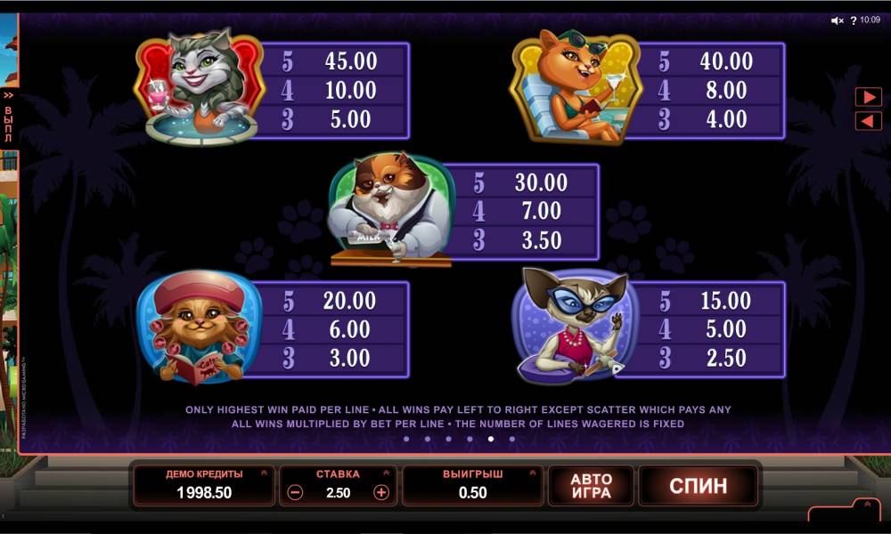 Pussycats continue to rule the Internet, as evidenced by the novelty presented by Microgaming. It's another pokie machine dedicated to these pets. True, here they are presented in the role of independent members of society, vacationing, judging by the name, in the Brazilian resort of Copacabana. However, the popular theme is not the main advantage of this video slot. The game pleasantly surprises with original features of gameplay, delightful graphics, funny animated inserts and a lot of other features.