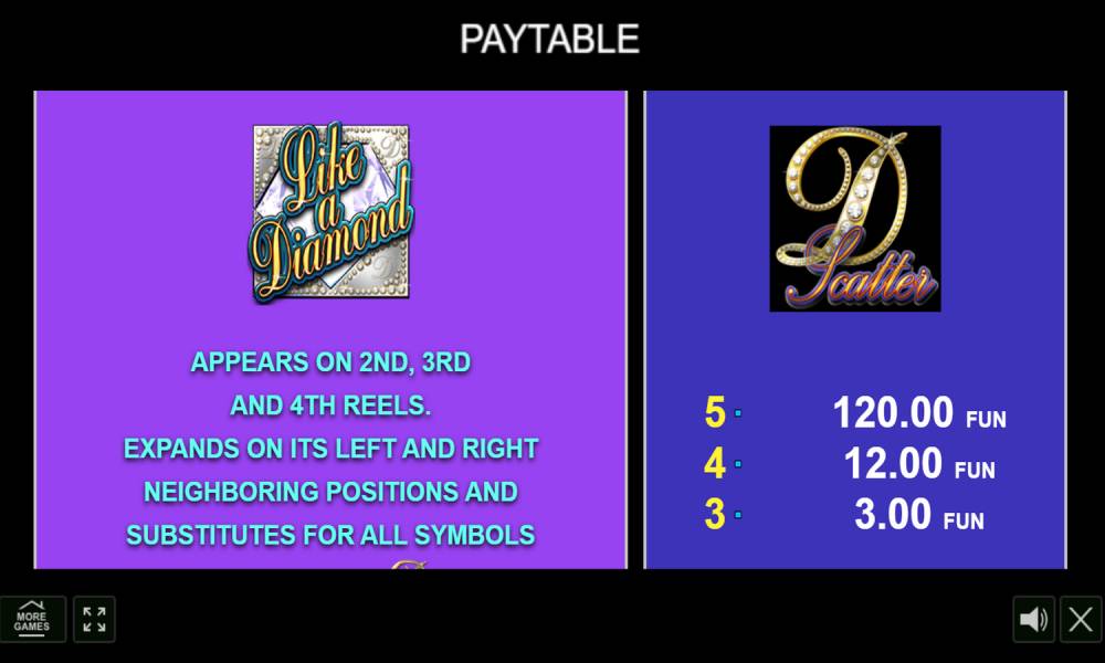 Pokie machine Like a Diamonds was released in 2017 by the provider Amusnet. The pokie has classic mechanics - the reels spin, show symbols and chains of symbols are stacked on fixed lines. Conducting calculations and estimating your winnings is quite simple. The machine does not spoil large prizes, but allows you to get frequent awards. Thanks to this, as well as bonus features, excitement and adrenaline is maintained at a high level, players enjoy the process to the maximum.