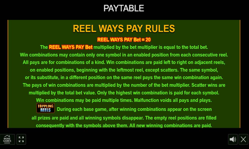 Toppling Reel Feature. When a winning combination falls on the field, the symbols that make up the combination disappear. In their place are dropped new ones. Such an avalanche can occur during one spin an unlimited number of times, which gives the opportunity to get more prizes.