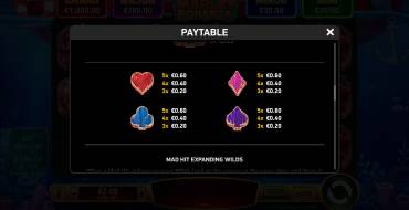 Ruby Play Mad Hit pokies (and Mad Hit Marlin Bonanza among others) have similar mechanics and rules. The game is played on a field of 15 cells (5 reels in 3 rows, in the bonus round there are 4 reels). There are 12 symbols: 9 basic and 3 special. There are jackpots and free spins. Put can be from 0.10 and up to 40 euros (or the same amount in another currency accepted in the casino), and win up to x5567. Payouts are awarded for lines from left to right that include a minimum of 3 identical (or including Wild) symbols. When 2+ winning combinations fall out, only one, the most expensive one, pays.
