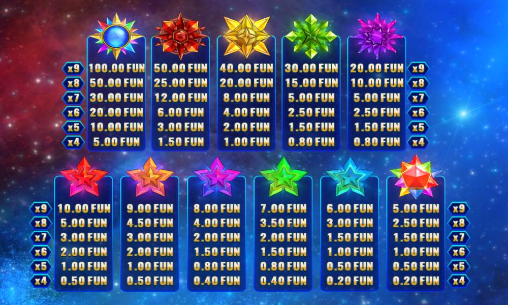 Blue star symbol - activated in Stars Bonus Free Spins mode and remains in place until the end of the bonus game, increasing the chances of winning combinations.