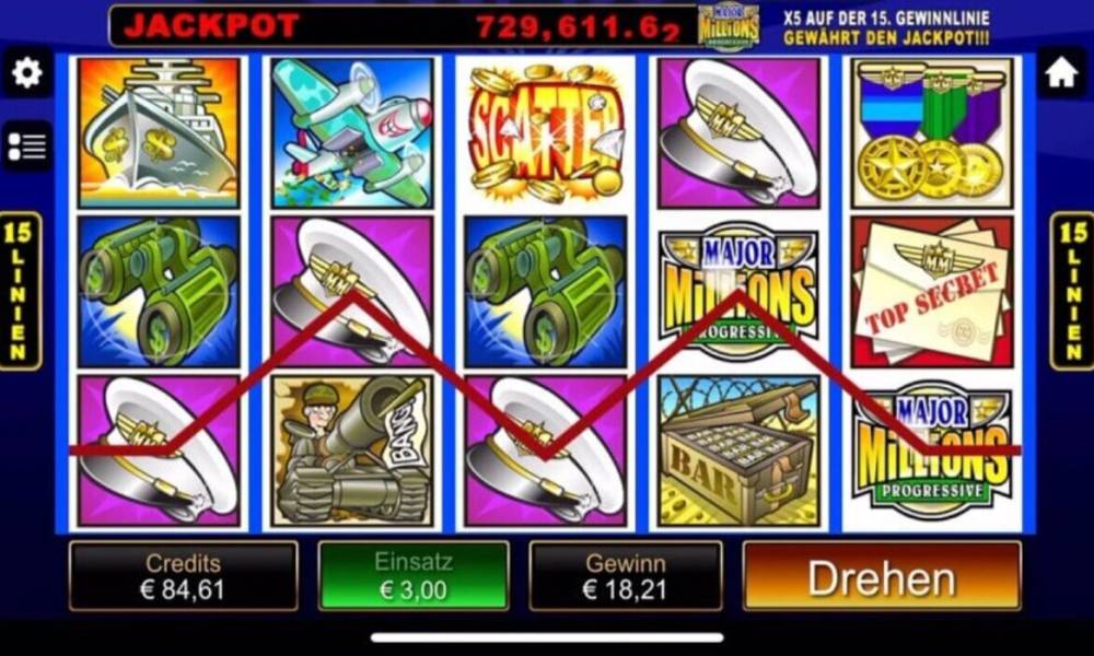 By playing this pokie machine, you will be able to get a different feel for the game. The symbols in the Major Millions 5 Reel - Progressive game are no match for the previous cherries and bars. The illustrations of the symbols are excellently drawn. Keeping the style, the artist has worked hard, creating unique, memorable symbols, which shows the whole plan of military action! There are airplanes, tanks, and explosives. The symbols are very dynamic and appear in front of us mixed with more static symbols on the military theme. These include a folder labeled "Top Secret", binoculars, a major's cap and, in fact, the major himself, who is smiling all over the place! Probably, he got one of those medals, which can also be seen among the symbols. There are scatter symbols in the game, as well as a wild symbol.
