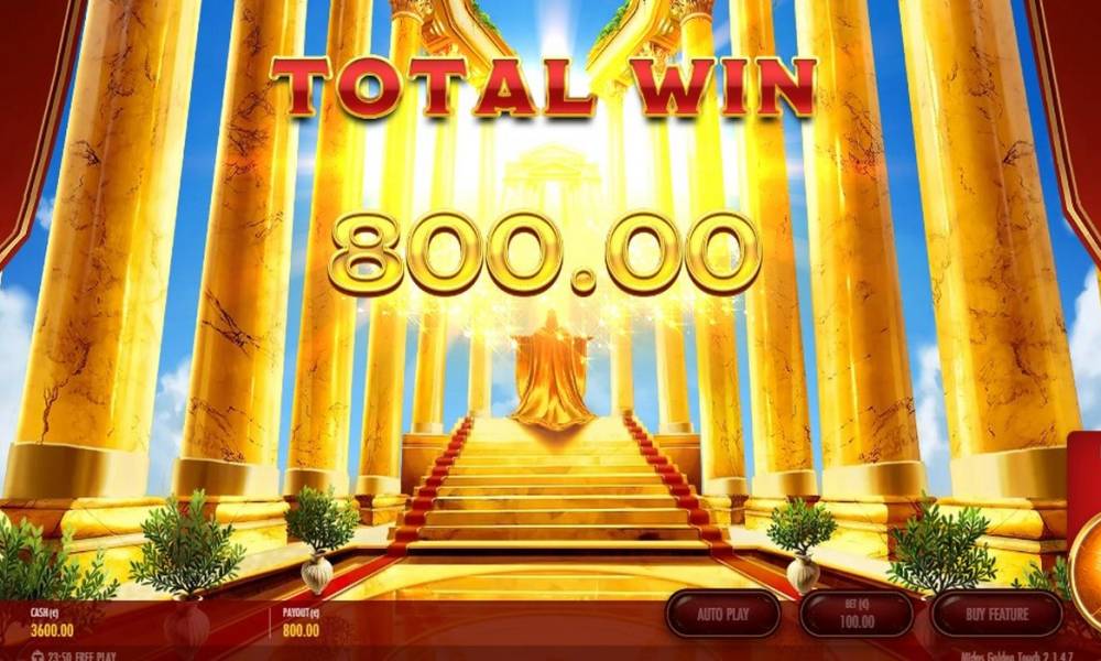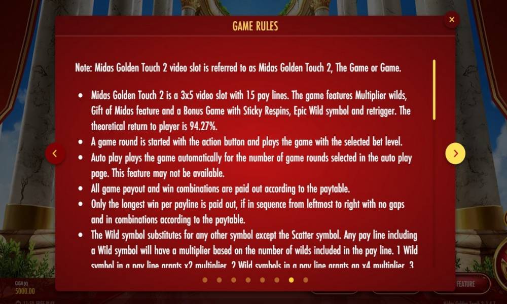 The Midas Golden Touch 2 video pokie offers play on 5 reels with 3 rows and 15 paylines. Scoring is done from the leftmost reel to the right. You can wager from 0.10 to 100 euros. When falling out 3 or more identical symbols a multiplier is given, the size of which can be viewed in the payout table. If one Wild symbol appears on the playing field, the gamer will get x2 to the winnings. The more Wild symbols fall out on the lines, the higher the multipliers. When 2 Wilds fall out, the winnings are multiplied by x4, 3 symbols give x8, 4 - x16 and 5 symbols - x32 to the set bet. The Bet+ buy-in feature is available in the game, which will give you the opportunity to win the bonus game, increasing the odds by 2 or 5 times. The maximum winnings reach x15,000.