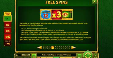 The Mighty Symbols: Crowns pokie has a bonus game with free spins. It is activated by three Scatter symbols on reels 1, 3 and 5. Before the free spins start, their number is determined randomly. They can be 3, 5, 7, 9 or 12. The frispins multiplier is also determined randomly, it can be 1x, 2x, 3x, 4x or 5x. The location of the giant Crown Wild symbol can appear on reels 1-3, 2-4 or 3-5, and can move through these positions with each spin.