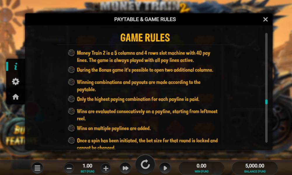 The playing field of the video pokie Money Train 2 is presented in the form of 5 reels in 4 rows with 40 fixed paylines. Winning combinations are formed from identical symbols located from left to right of the leftmost reel (no skips). Identical symbols are paid starting from 3 pieces, the size of multipliers can be found in the pay table. Maximum multiplication x20 to the bet gives the fallout of 5 Wild symbols, as well as 5 Necromancer. Besides usual symbols and traditional Wild and Scatter, the game has special symbols that appear only during the bonus feature. The betting range is from 0.10 to 20 euros.
