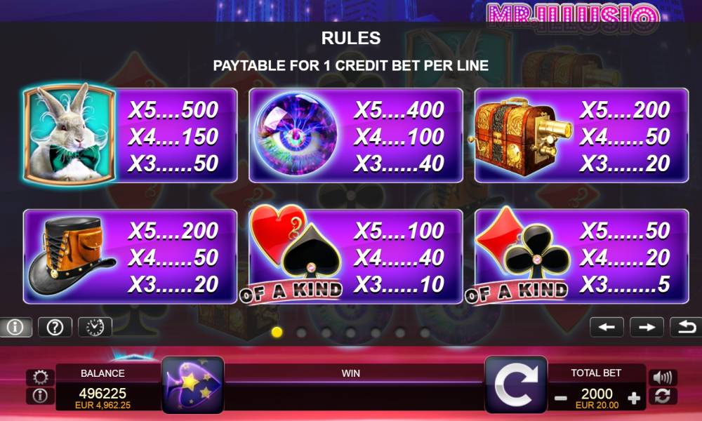 The gaming symbols, imaged at the reels of this video slot, are very colorful card suits, illusionist’s hats, a magic chest, a crystal sphere and a white rabbit. Same suits may form vertical stacks at the reels.