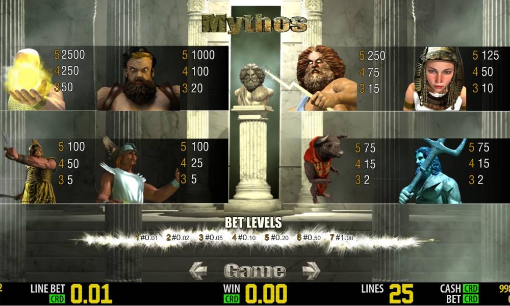 The developers of online games for online casinos often refer to this topic as well and release new video slots. «Mythos» model, which the following review is devoted to, is also one of this category. It is an impressive slot machine with 3D elements, which can pleasantly surprise with a great variety of gaming features and quality of the interface.