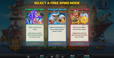 Sticky Mystery Free Spins. The player is given 5 free spins. Mystery symbols can appear on reels 2-6 and become sticky after each cascading win. There are three types of mystery symbols: regular, octopus and bomb. The octopus turns all matching symbols on reels 2-6 into mystery symbols, while the bomb destroys all regular symbols that do not participate in the win. An extra spin is added for every three filled steps in the counter.