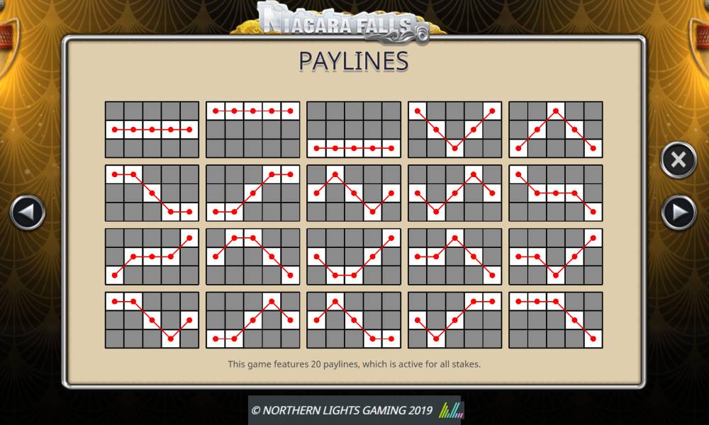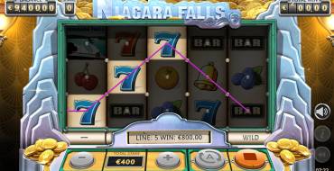 The Niagara Falls online slot machine has five spinning reels and twenty lines for combinations, which are always active on default. Fifteen symbols line up in three rows at the screen.