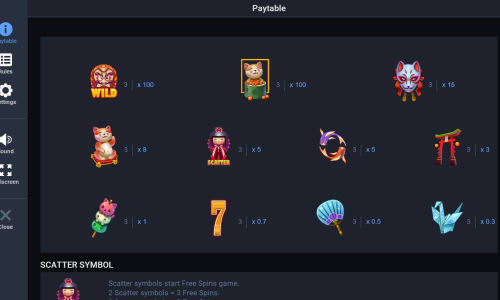 The interface of the game is very simple. At the bottom of the interface you will find buttons to select the bet, start autoplay, normal spins and activate fast spins. On the left side you can open the settings menu, rules and payout table.