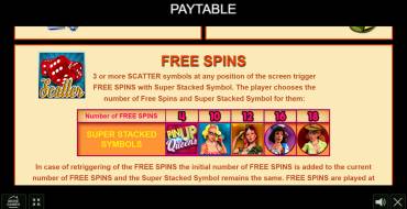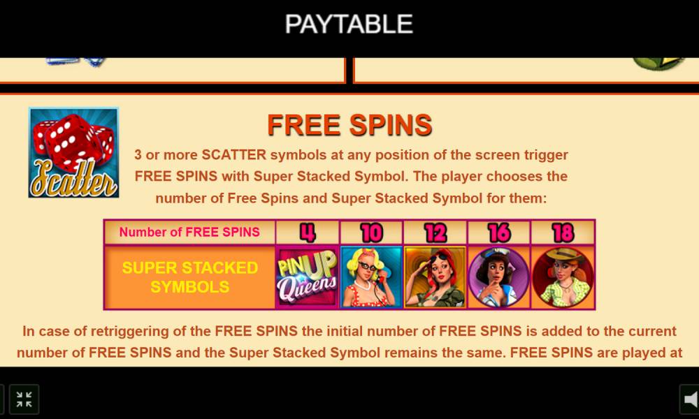 The trigger for the free spins to begin is when three or more Scatter symbols appear in any positions. Then the player can choose the number of free spins and one Super Stacked Symbol. If one wants a Wild symbol, there will be only four freespins with it. You can also choose one of four images of beauties, the cheaper it is, the more spins - 10, 12, 16 or 18. Free spins can be restarted and then the new number of spins will be added to the remaining number of spins.