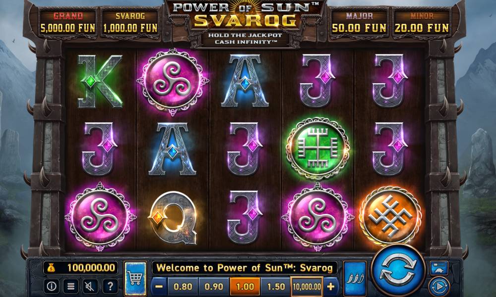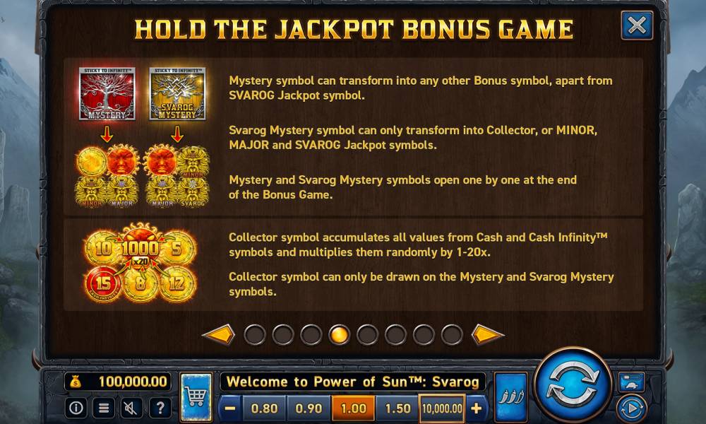 The Power of Sun: Svarog by Wazdan uses a standard 5x3 grid with 243 paths to form winning combinations. To win, identical symbols must fall on adjacent reels starting from the leftmost reel. The Svarog symbol acts as the Wild symbol and substitutes for all other symbols except the bonus symbols. The betting range varies from 0.2 coins, up to 10000 coins. The pokie offers bonus symbols such as Cash Infinity and Mystery Symbols, which stick to the reels and help activate Hold the Jackpot, a key bonus round. You need to collect 6 or more bonus symbols to trigger it. Various jackpots can be won in this mode, including a Grand Jackpot of 5,000x your bet.