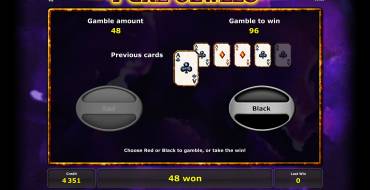 Then the player decides what to do with his money. There are two options: transfer it to the account immediately or stake in the gambling feature. In the second case the special screen with a face-down cards appears. Your aim is to guess its color. Correct answer would double up your payoff. However, the wrong answer means that you lose the bet. It is possible to play several times running, but there is no right for mistake. There is the maximal limit, which can’t be exceed.