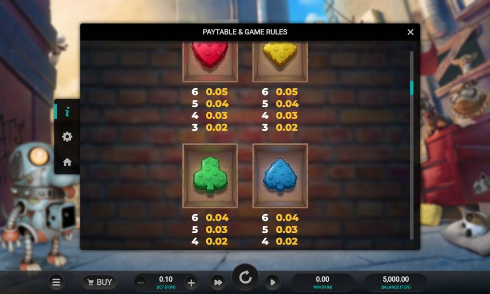 The Purrrminator uses a 6x4 playing field with no fixed lines. Combinations are made according to the principle of cascade, with the condition of mandatory contact of characters horizontally and diagonally. In total, there are 9 regular and one special symbol in the game. During the bonuses on the reels appear auxiliary symbols. The player chooses a suitable size bet from the range of 01 to 200 euros, from the preset options. During the regular game mode, bonuses in the form of Reverse Avalanche Feature are possible. In free spins mechanics accompany almost every round. Quite nice technical parameters of the pokie machine make it extremely interesting even for novice users who are just gaining experience. Combinations are made from left to right, they involve from 3 to 6 symbols.