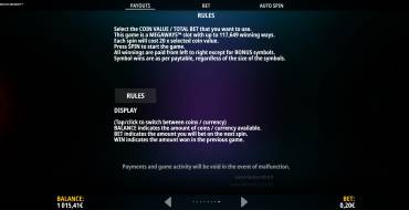 The payout table is divided into sections. The help explains the rules. It also lists the technical specifications.