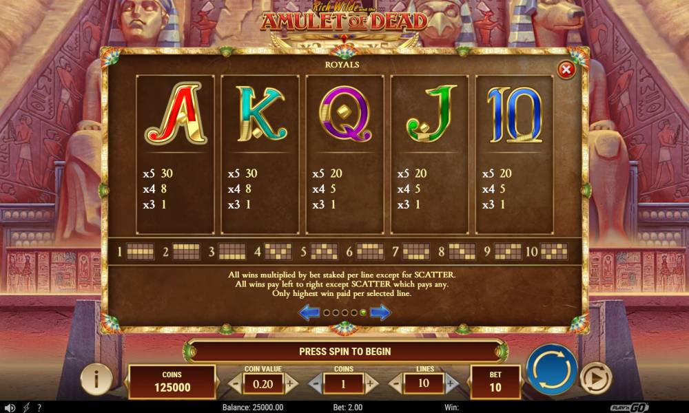The Rich Wilde and the Amulet of Dead slot machine from the Play’n Go provider has a standard 5x3 playing grid. Payouts are made on 10 lines.