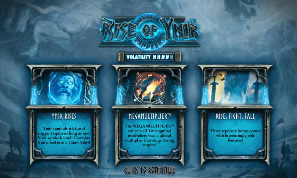 Ymir's Conquest. When the Ymir symbol appears in a win, its multiplier is applied to the payout and then a re-spin is triggered. Wild symbols remain in place, and if another wild symbol appears, the spins continue until new symbols stop appearing. If four Ymir symbols appear on the same reel, they combine to form a giant symbol with a total sum of all multipliers, which increases payouts.