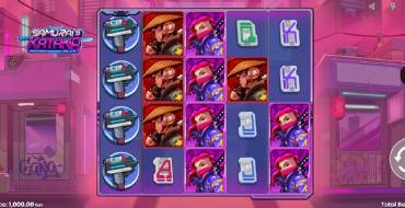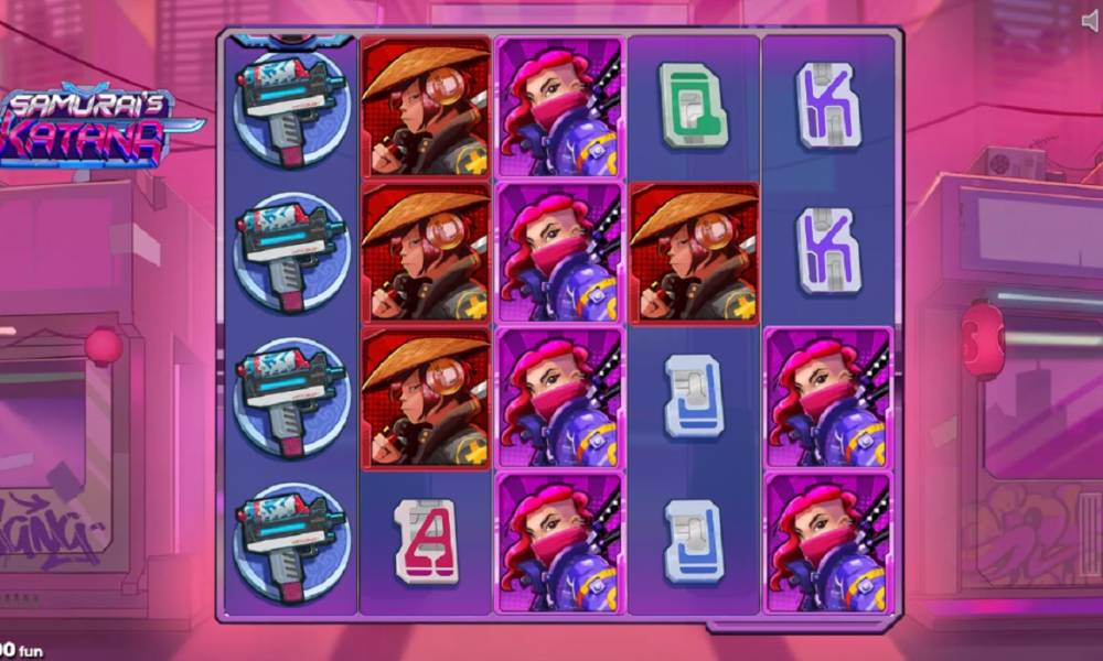 The game action in Samurai's Katana pokie is set against a neon-drenched urban backdrop, where tall skyscrapers and graffiti symbolize the collision of traditional approaches with innovation. The main characters are a man and a woman who are modern cyberpunk samurai. They are the most valuable symbols of the pokie. Of lesser value are the shoes and the gun. There are also low-paying signs of senior playing cards.