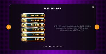 Blitz Mode. When at least one Cashpot symbol stops on the reels, this feature is triggered. The base game keeps going, but now the user has three spins to collect even more rewards. If the Cashpots stop again, the spins will resume up to three. No - the feature will end when there are 0 spins left. All special symbols have their own cash value, which is counted in the counter above the reel. The cell where the symbol has fallen out is illuminated. If the whole column will be in the lighted frames the user will immediately receive all the prizes accumulated in the counters, and it will reset to zero and can further accept awards. Also, all Cashpots symbols are summed up to then give the jackpot. Special symbols can only fall on reels 2, 3, 4 and 5 in this round, and therefore there are only 4 possible jackpot wins.
