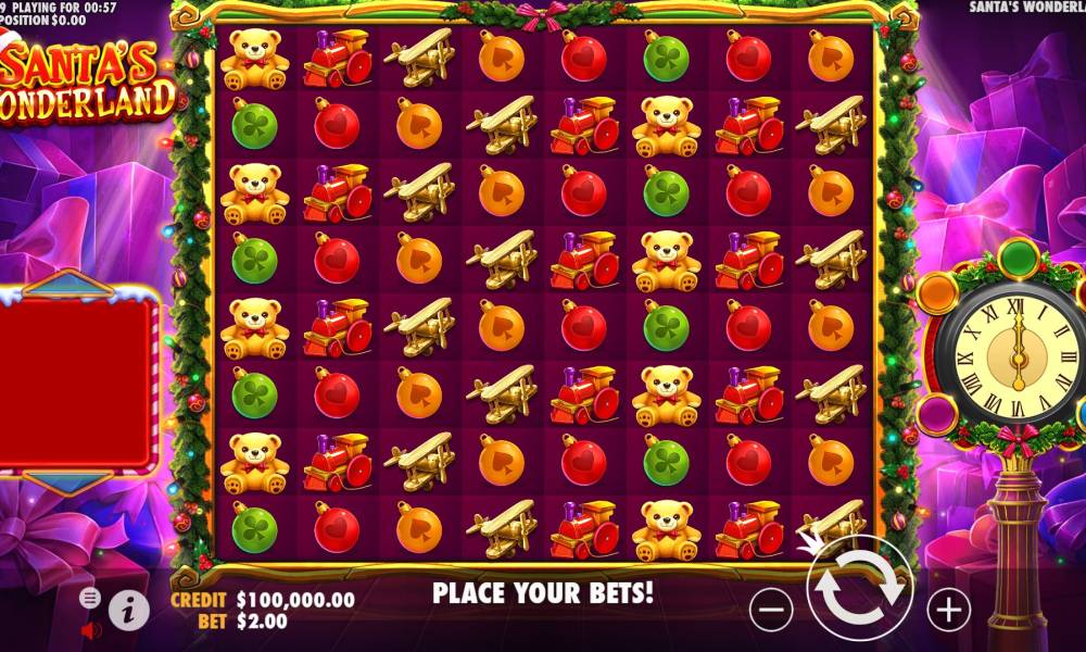 The Santa’s Wonderland slot machine from the Pragmatic Play provider has an 8x8 playing field. Payouts are made on the Cluster Pays system.
